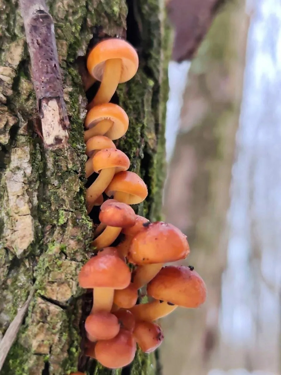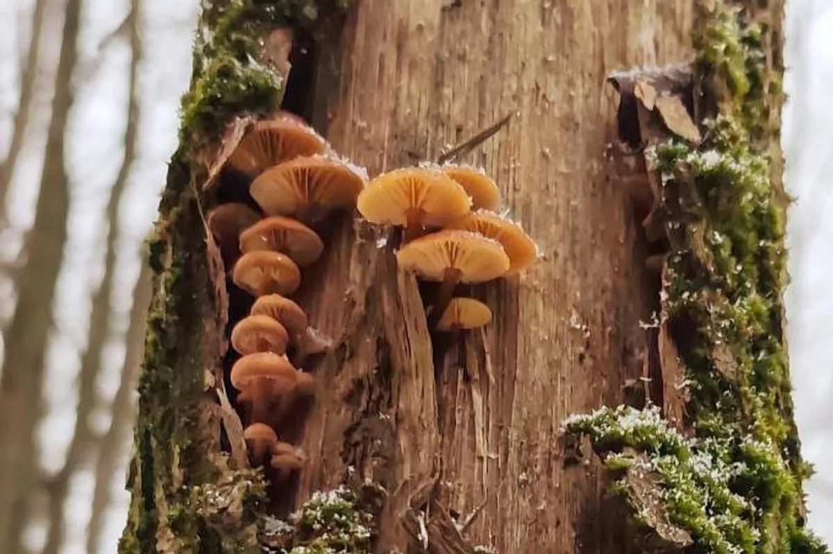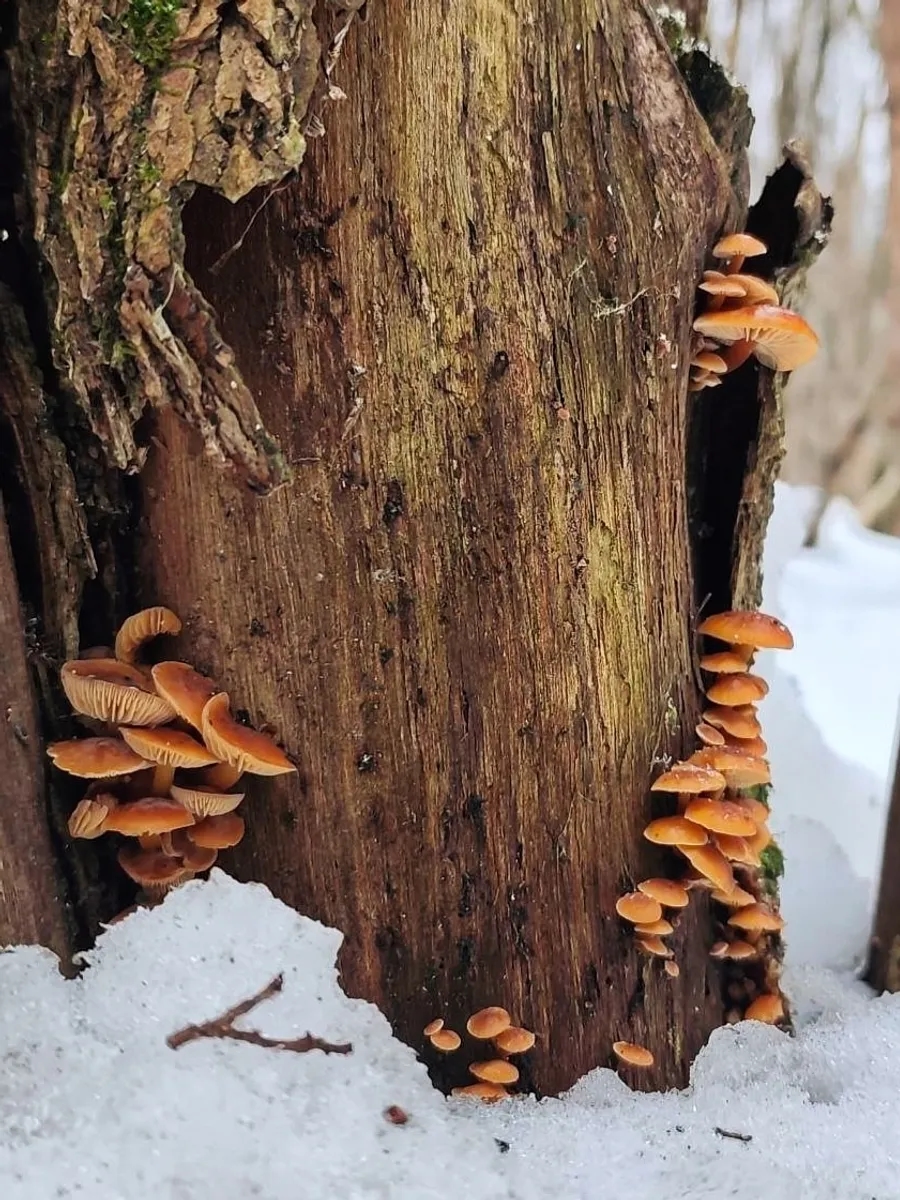 Зимние опята , известные учёным под названием Фламмулина бархатистоножковая, вешенки, которые способны замерзать, а при оттаивании - продолжать свой рост, и деликатесная Tremella mesenterica Retz - дрожалка оранжевая, за которой охотятся гурманы - таков впечатляющий "улов" заядлого грибника, рискнувшего попытать счастья в февральском лесе.