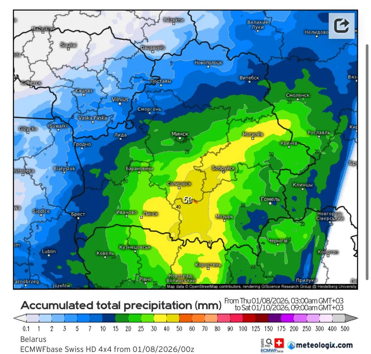 Согласно модели ECMWFbase Swiss HD 4x4, самые сложные погодные условия в Беларуси будут с 8 по 9 января. За это время в стране выпадет до 1–1,5 месячной нормы осадков. В первую очередь — по востоку Брестской, западу Гомельской, юго-востоку Минской и юго-западу Могилёвской областей. Об этом сообщил метеорологический канал "Метеовайб".