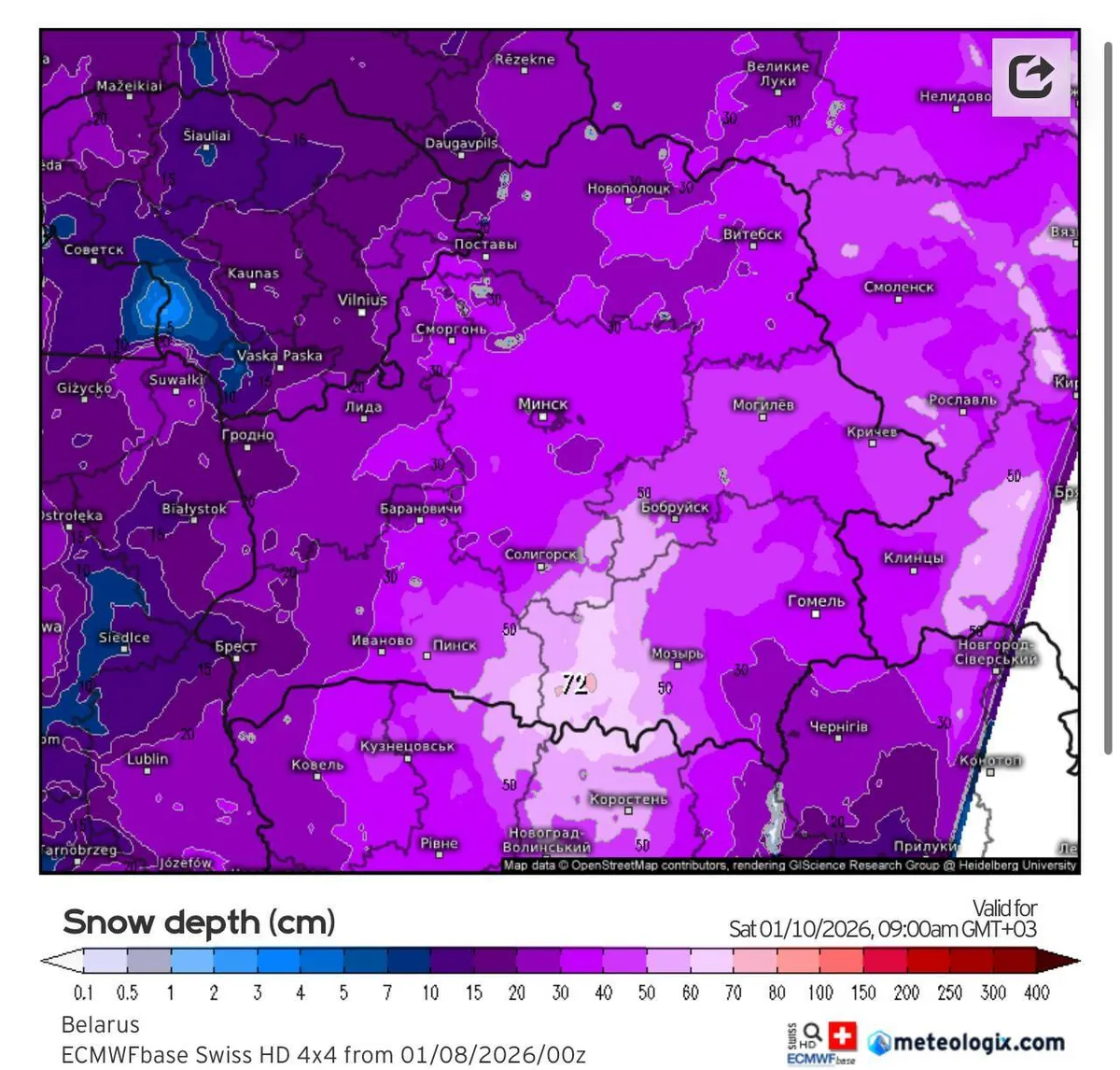 Что касается расчётов модели WRF от Белгидромета (Белгидромет — Белорусский государственный гидрометеорологический комитет), то на завтра, 9 января, к полудню к юго-востоку от Минска, где-то на стыке Минской, Могилёвской и Гомельской областей, она также прогнозирует много снега. Высота снежного покрова достигнет 50 см.