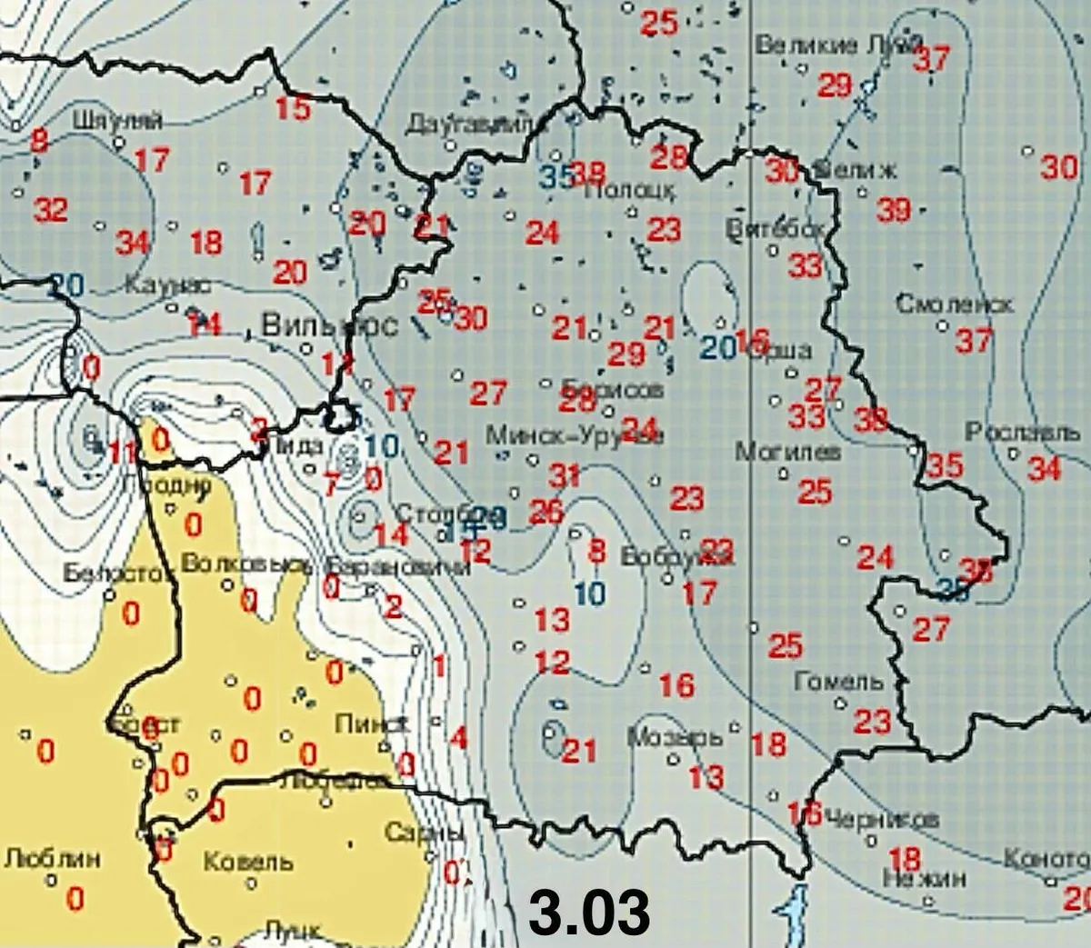 Тем не менее, сама воздушная масса будет очень холодной и сулит ночные заморозки до -25..-35°С в самых холодных своих точках. Белорусам столь суровые морозы, к счастью, не грозят, но к понижению ночных минимумов всё же стоит быть готовым.