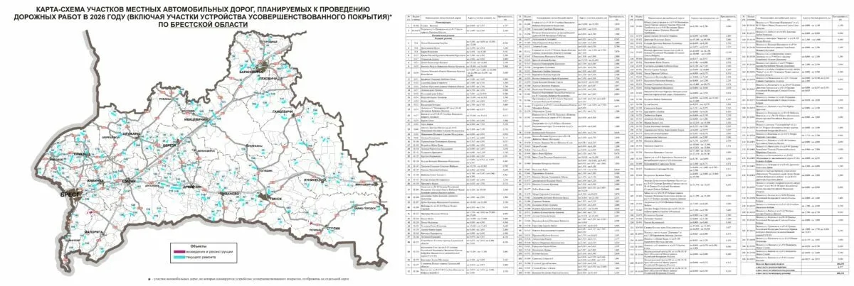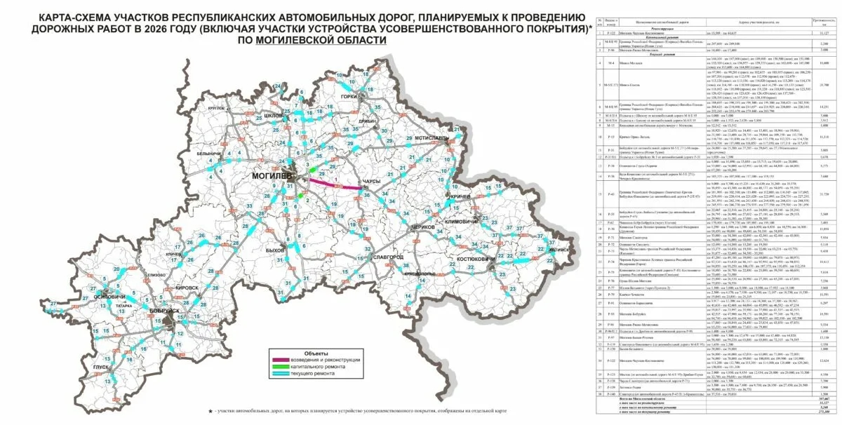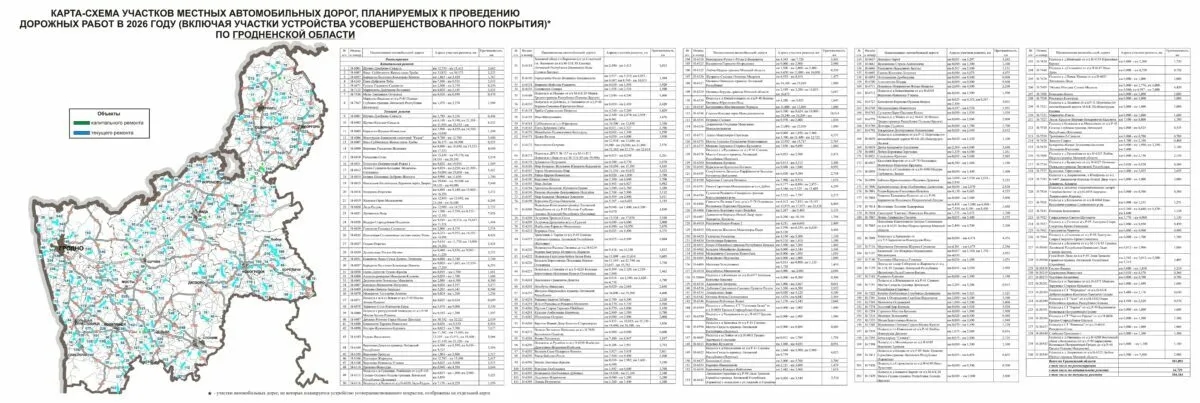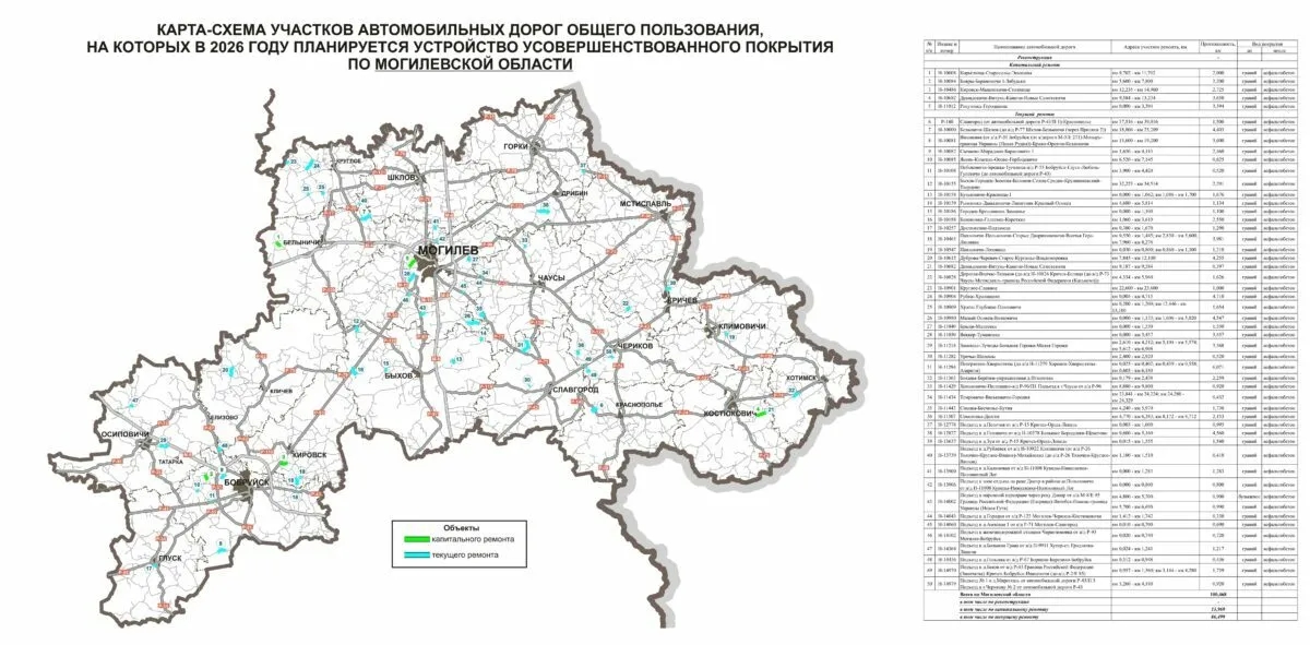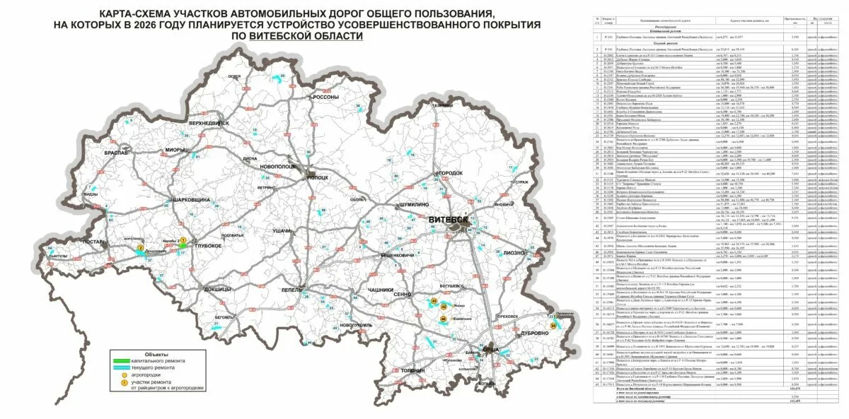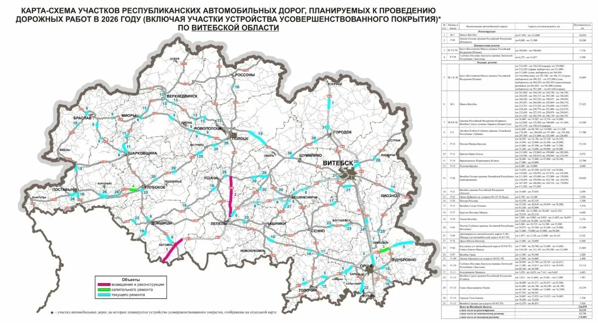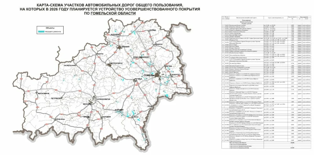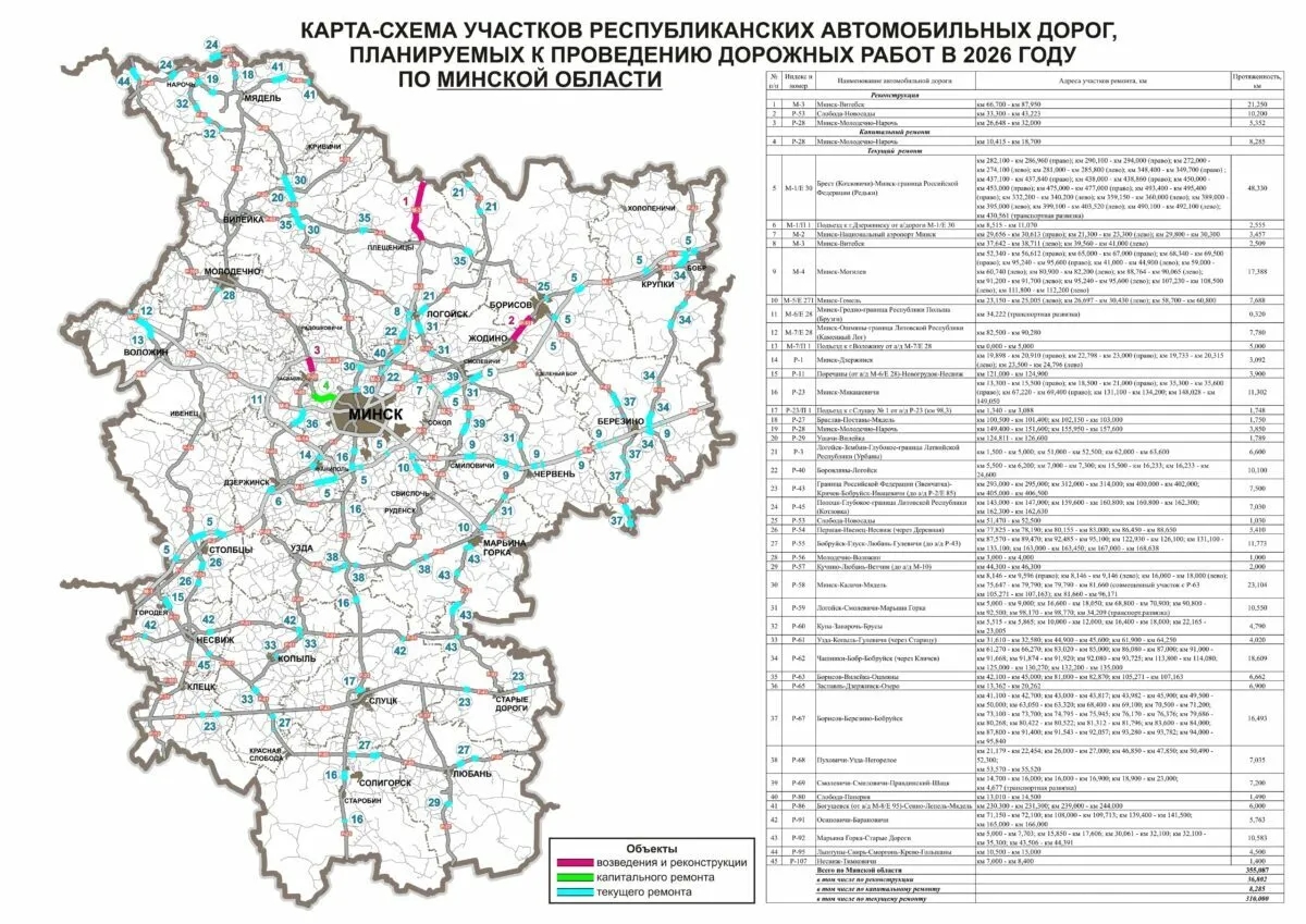 Министерство транспорта Беларуси опубликовало карты дорог страны и их отдельных участков, где в 2026 году планируется ремонт. В планах ведомства - не только ремонт, но и укладка "усовершенствованного покрытия" (как правило, это асфальт или бетон).