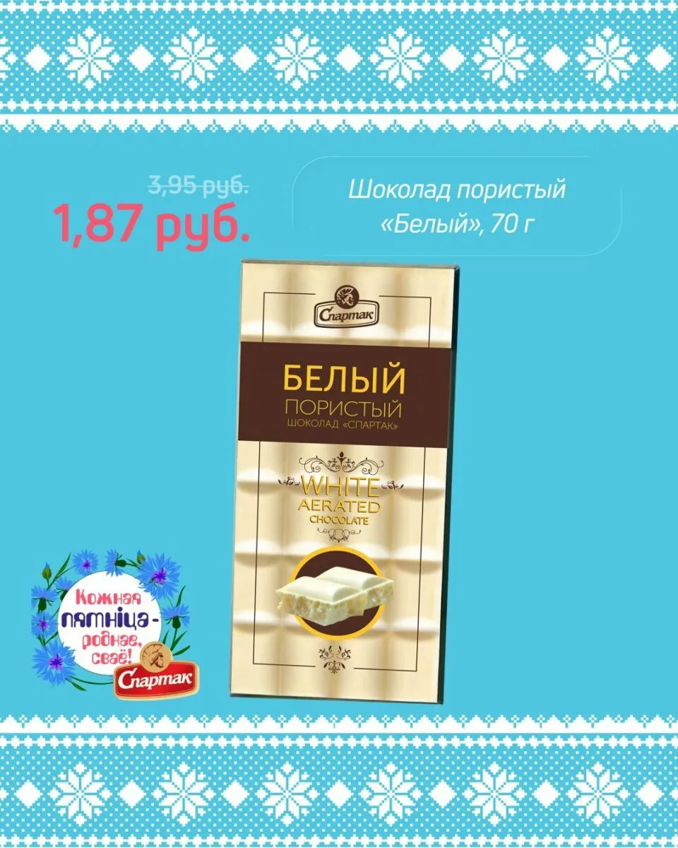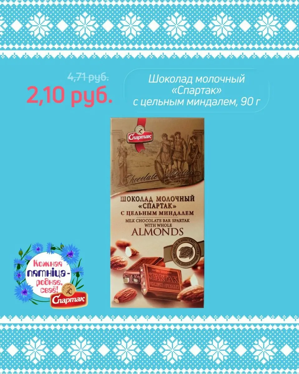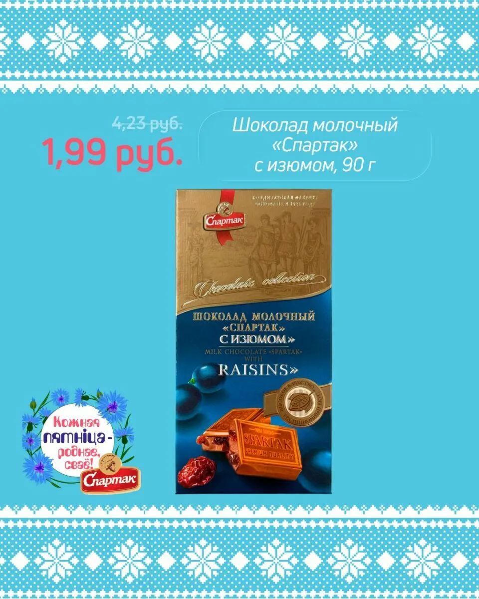 "Вкусную выгоду" покупателям пообещали во всех фирменных магазинах "Спартака". В рамках акции за полцены (а в некоторых случаях - даже дешевле) белорусам пообещали набор шоколадных конфет со ассорти вкусов алкогольных напитков, плитки белого пористого шоколада, а также молочного шоколада с изюмом и цельным миндалём.