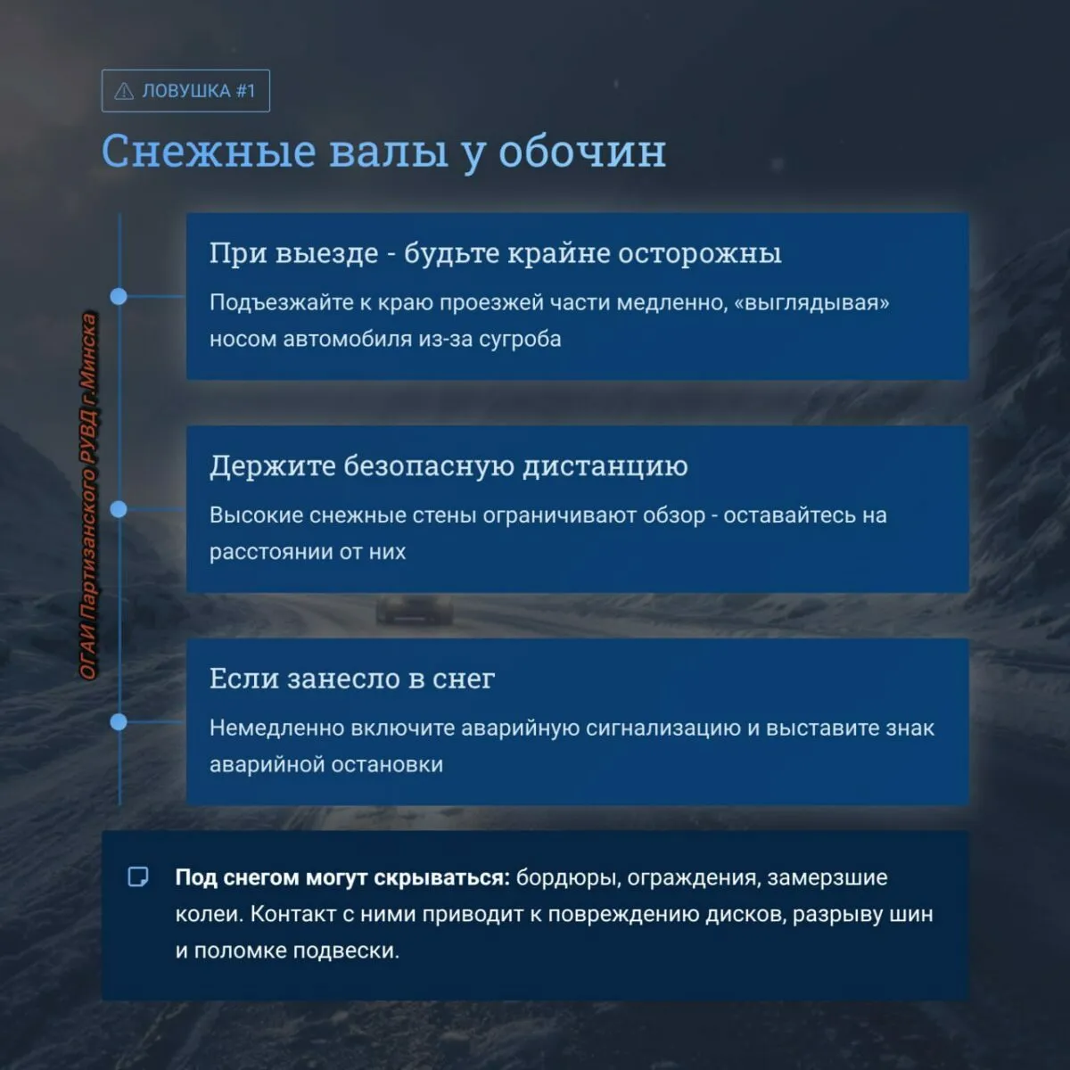- снежные валы у обочин, которые опасны не только сами по себе из-за повышения риска заноса, но и тем, что под ними скрывается - невидимые под снегом бордюры, камни или, наоборот, глубокая колея;