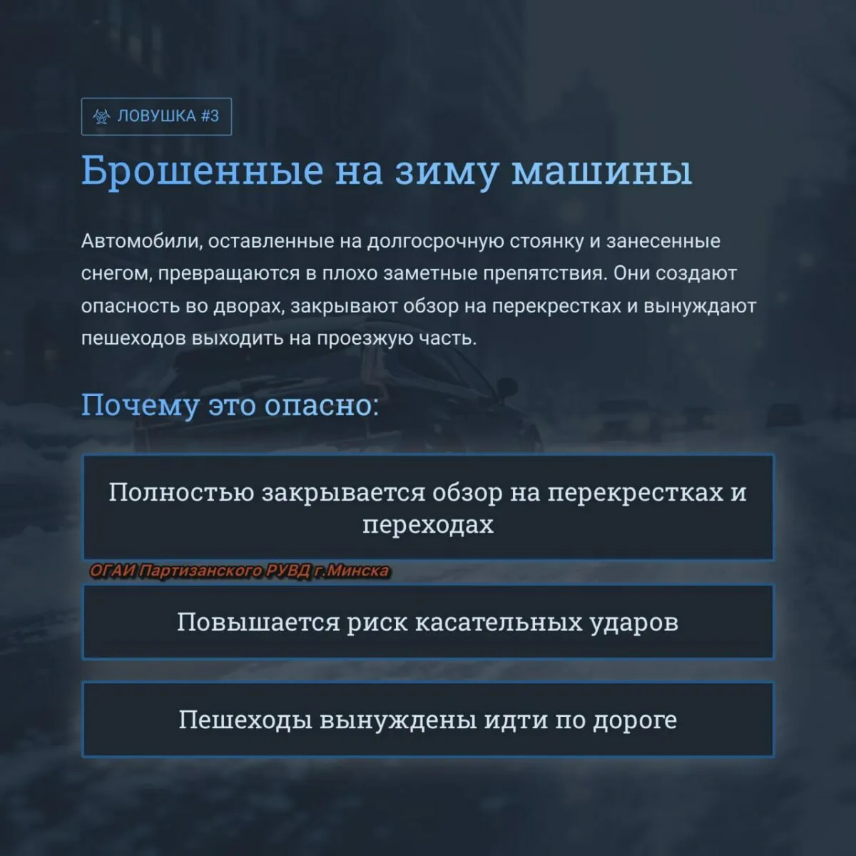 - брошенные у обочины машины. Во время снежного бурана такие "брошенки" часто на какое-то время превращаются в единый снежный сугроб. Мало того, что их самих не видно и можно зацепить как минимум по касательной, так они ещё и ухудшают обзор другим водителям, особенно на перекрёстках и у выездов со дворов. Это однозначно место для повышенного внимания водителя.