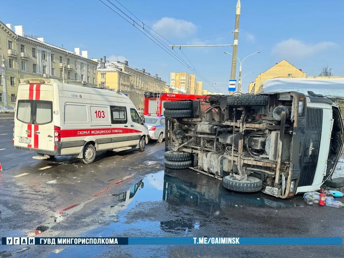 В Минске легковушка "подрезала" мусоровоз - тот перевернулся