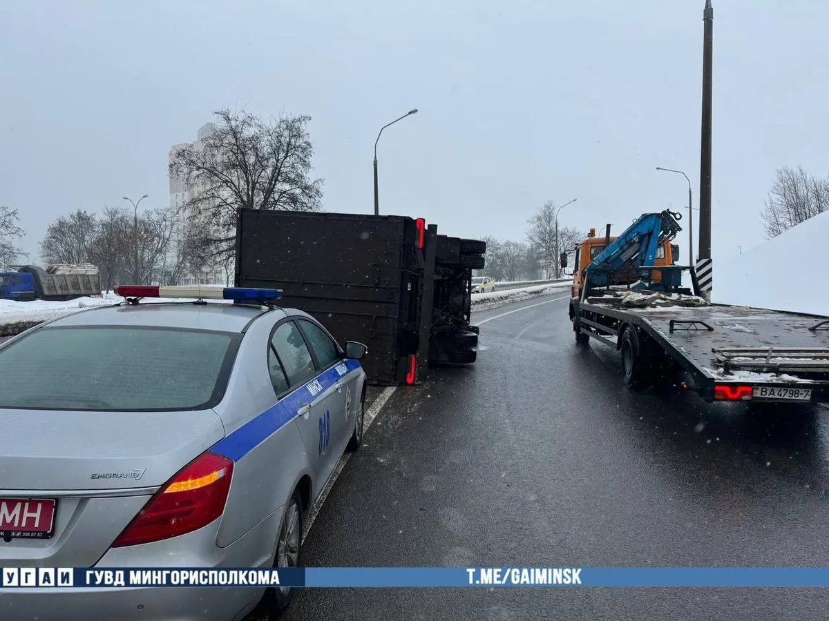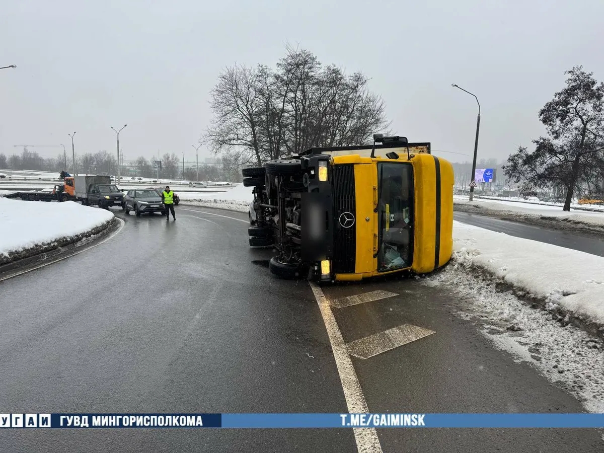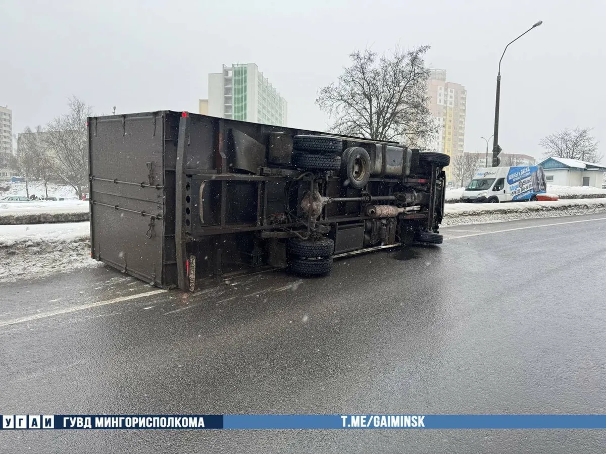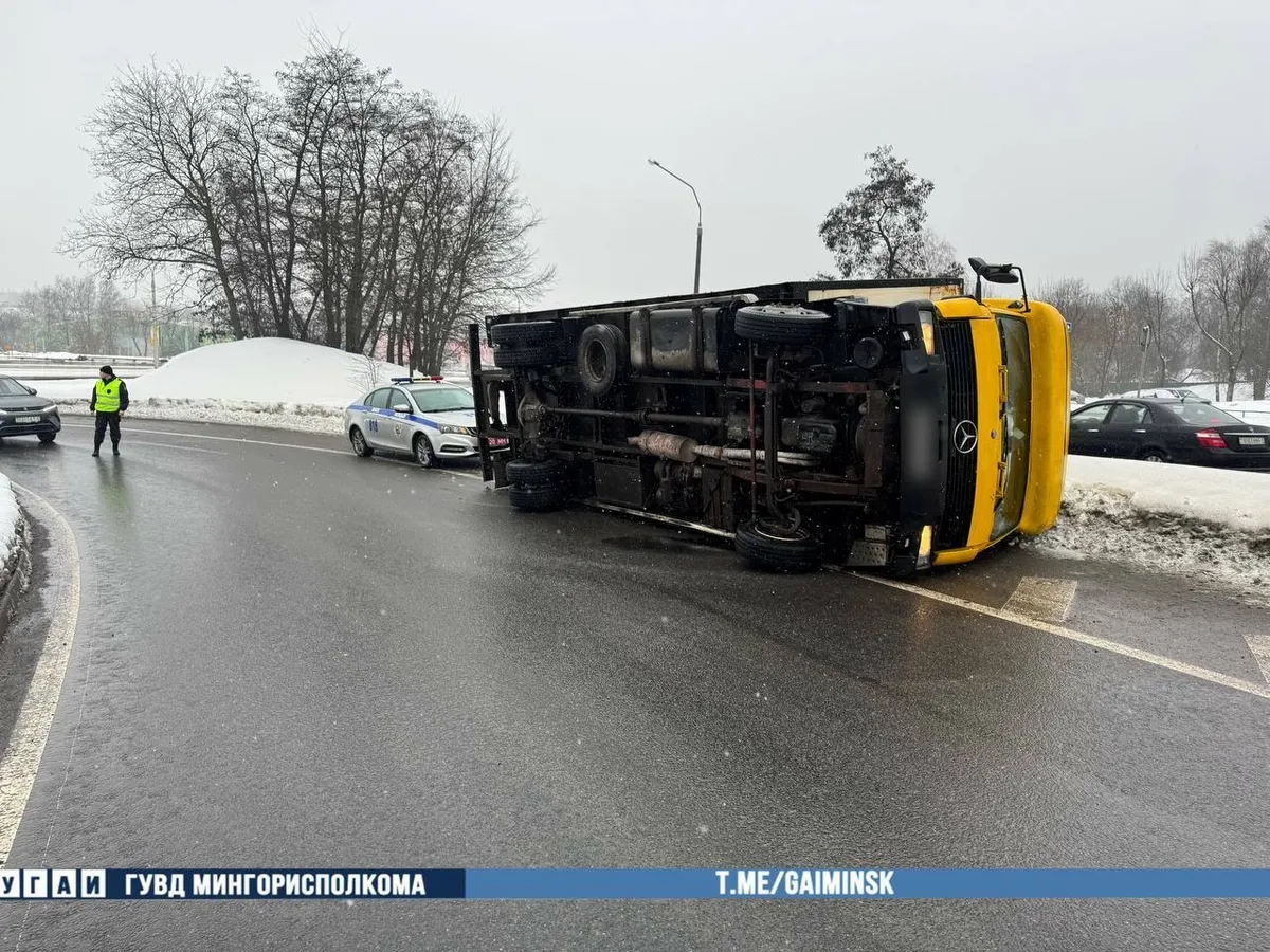 В Минске на Партизанском проспекте произошло необычное ДТП, в котором участвовал лишь один грузовик Mercedes. Прямо на проезжей части без участия других участников дорожного движения он опрокинулся.