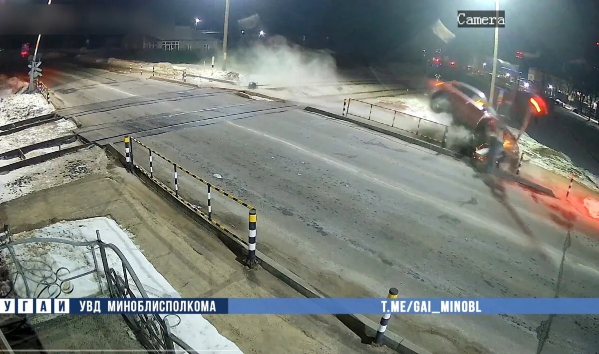 В Молодечно 22 февраля 39-летний мужчина разогнался на чужой Audi Q5 и въехал в железнодорожный переезд. Там он врезался в шлагбаум и перевернулся. ДТП попало на видео. Инцидент произошел на улице Машерова.